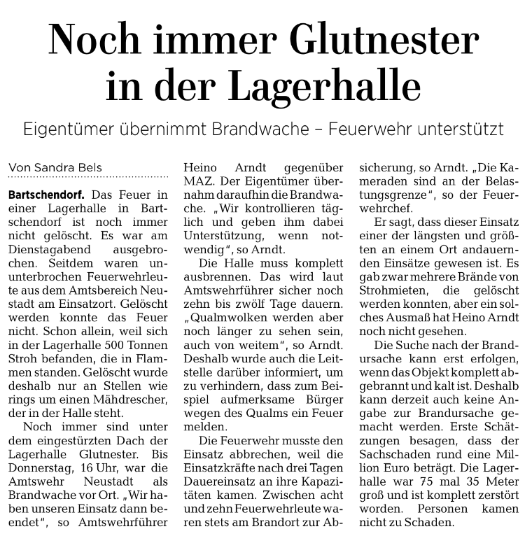 In Vollbrand geriet eine landwirtschaftlich genutzte Lagerhalle am 12.1.2021 zum späten Nachmittag aus bisher unerklärter Ursache. Es konnten durch Angestellte des Betriebes und eintreffende Einsatzkräfte zum Glück noch sämtliche Tiere aus dem Gebäude gerettet werden. Auch konnte die Feuerwehr - ein Großaufgebot aus allen Einheiten des Amtes Neustadt, mehrere Fahrzeugen aus der Gemeinde Wusterhausen und dem Amt Friesack (ca. 120 Kameraden) - ein kleines Tanklager und einen Mähdrescher sichern. Nicht mehr zu retten waren mehrere Traktoren, Verladewagen, weitere landwirtschaftliche Maschinen und ein Heudepot von schätzungsweise 500 Tonnen. Der Einsatz verlief äußerst schwierig, da das doch sehr große Gebäude an mehreren Stellen einstürzte und permanent eine Gefahr für die Rettungskräfte bot.