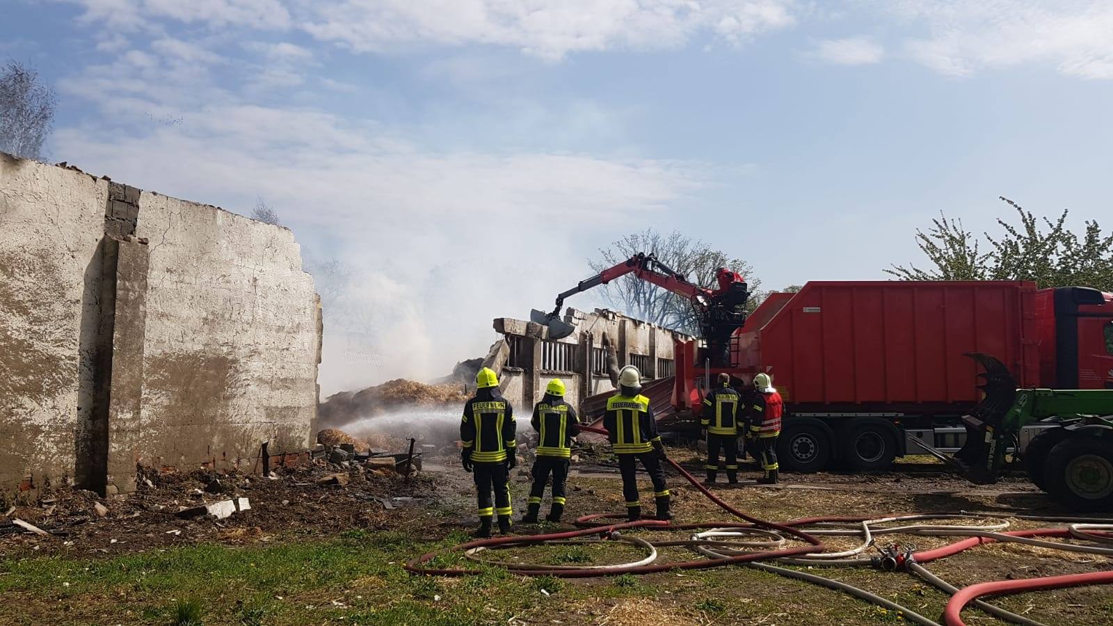 Neustadt(Dosse) - In Roddahn ist am Mittwoch gegen 9:44Uhr in einem landwirtschaftlichen Betrieb ein Feuer ausgebrochen. Zu dem Brand kam es in einer ca. 30 mal 10 Meter großen Scheune, in welcher Stroh gelagert wurde. Auf dem Dach, welches komplett niedergebrannt ist, befanden sich Photovoltaikanlagen. 40 Einsatzkräfte bekämpften das Feuer vor Ort. Nach ersten Erkenntnissen kamen weder Menschen, noch Tiere zu Schaden. Wie hoch der Sachschaden ist, kann zur Stunde noch nicht gesagt werden.